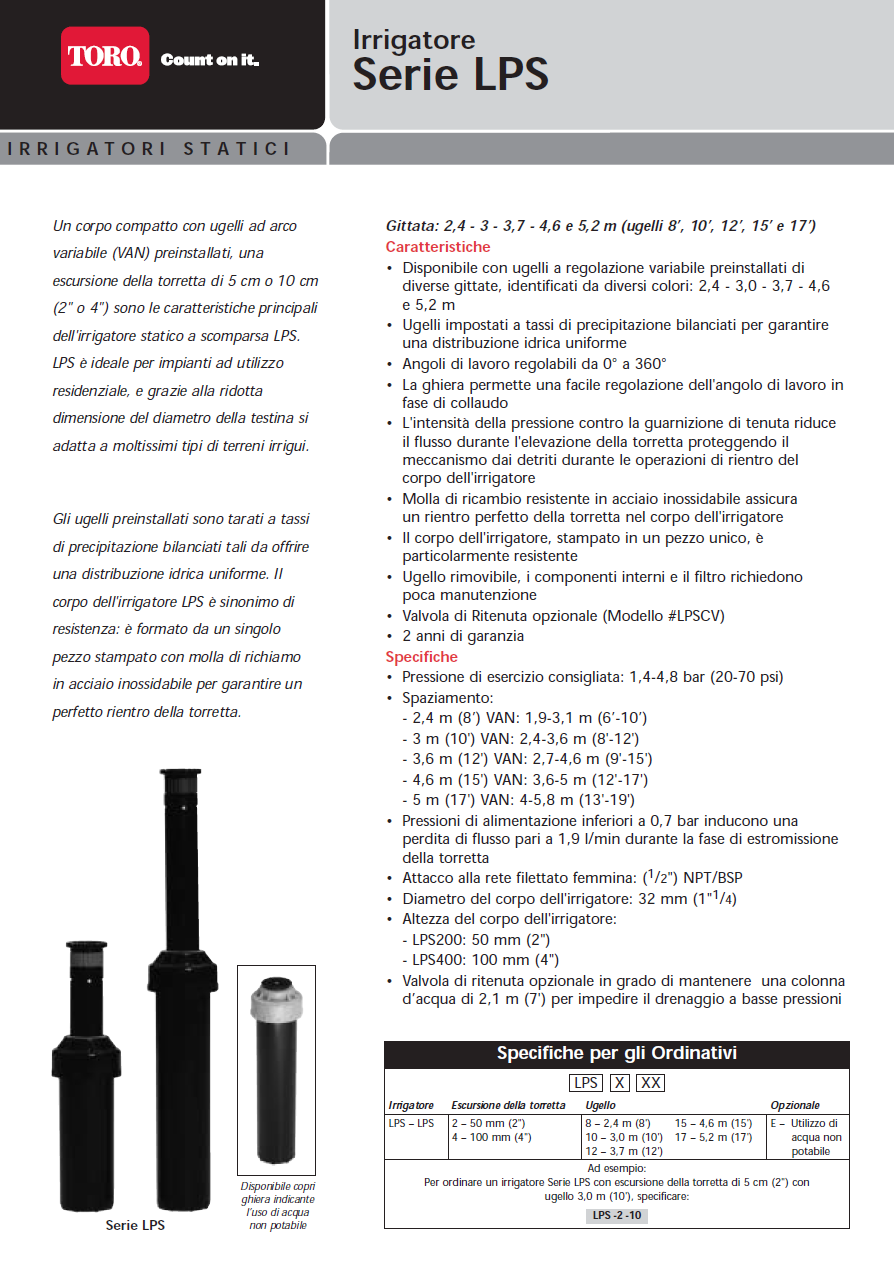 Gli irrigatori Toro® della Serie LPS soddisfano la domanda senza sacrificare la qualità. Irrigatori statici dotati di un robusto corpo compatto con guarnizione di tenuta a pressione che riduce la pressione di alimentazione durante l’escursione iniziale della torretta, proteggendo il