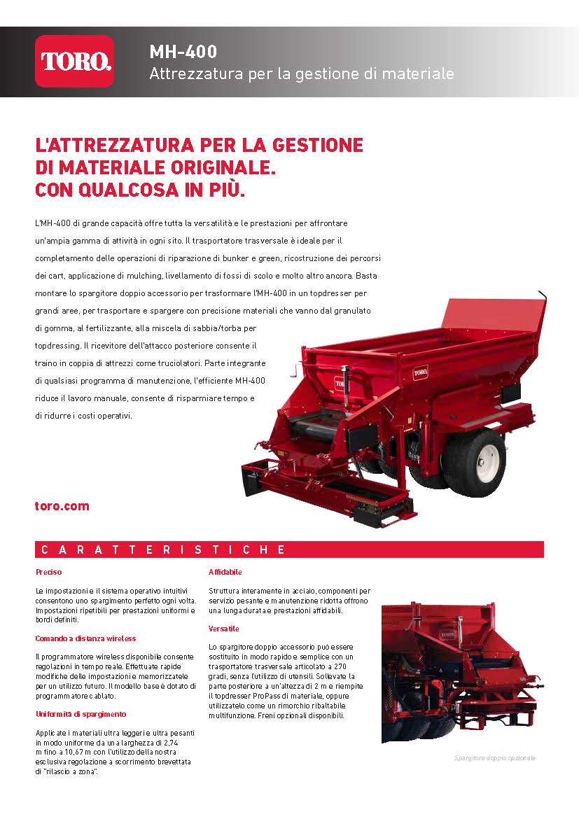 Il nuovo MH-400 di Toro versatilità e prestazioni di alto livello per la gestione di un’ampia gamma di lavori su qualsiasi impianto. Scegliete uno o entrambi tra il trasportatore trasversale e lo spargitore doppio per aiutarvi a ridurre la fatica, risparmiare tempo e tagliare i costi di esercizio.