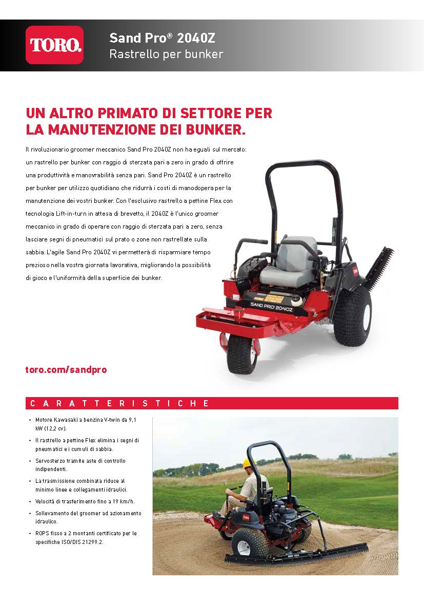 Il rastrello meccanico Sand Pro 2040Z completamente rinnovato è diverso da tutti gli altri attrezzi sul mercato: un groomer meccanico con raggio di sterzata pari a zero in grado di offrire manovrabilità e produttività senza paragoni. Questa macchina unica è un rastrello per bunker per l’uso quotidiano che ridurrà i costi di manodopera del campo da golf per le operazioni di rastrellamento sia meccanico che manuale dei bunker. Un nuovissimo sistema di rastrellamento “flessibile” con funzionalità “lift in turn” in attesa di brevetto consente all’operatore di svoltare rasente i bunker, senza lasciare zone a goccia non rastrellate o segni di pneumatici.