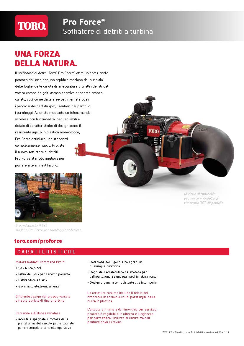 Il soffiatore Pro Force fornisce un volume del flusso d’aria superiore a qualsiasi altro soffiatore con ventola a turbina a ugello singolo attualmente disponibile. Un comando manuale a distanza wireless a radiofrequenza, che offre la possibilità di accendere e spegnere il motore, spostare l’acceleratore del motore in alto e in basso per regolare un range di velocità di rotazione maggiore o minore e ruotare l’ugello a 360 gradi – il tutto dalla postazione dell’operatore su un Workman Toro Serie MD o su un veicolo polifunzionale simile. Questo soffiatore offre una produttività eccellente e una maggiore efficienza in attività che vanno dalla pulizia dei percorsi dei cart e altre superfici asfaltate, alla rimozione di erba tagliata, carote di terreno o paglia, o altri scarti organici da fairway o campi da golf.